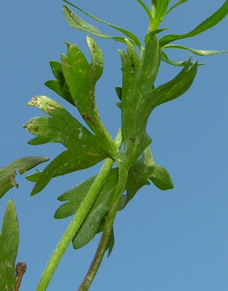 Stängelblatt sitzend, fast bis zum Grund in 3, 5 oder 7 schmal linealische Abschnitte geteilt