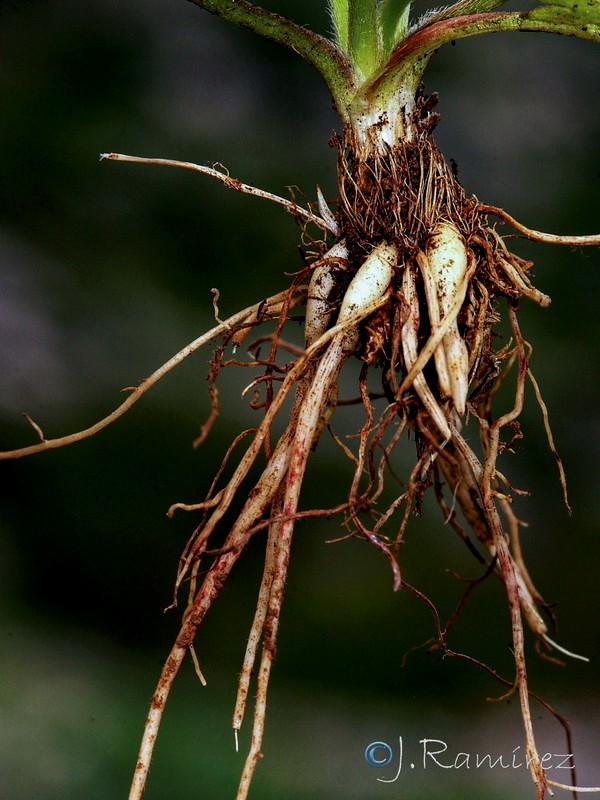 Stängelgrund breit, von bleibenden Fasern umgeben, mit zahlreichen kleinen Wurzelknollen, Wurzelknollen elliptisch,