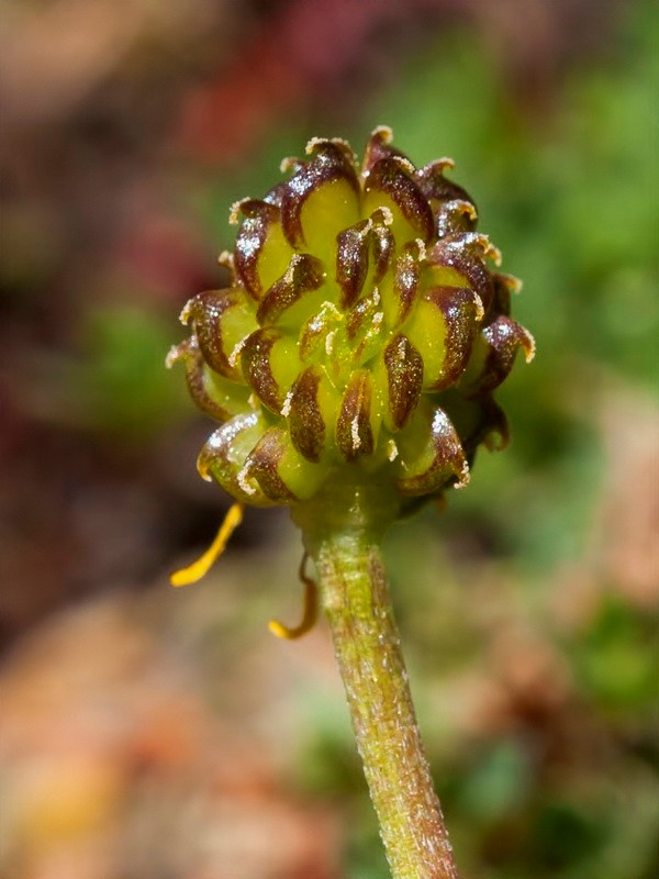 Blütenboden (Torus) kahl, Fruchtstand +/- kugelig, Blütenboden kahl, Früchte seitlich stark zusammengedrückt, dreieckig bis rundlich, 2,5 - 3 mm im Durchmesser, glatt, kahl, Fruchtschnabel 1 - 1,5 mm lang, meist hakig gebogen