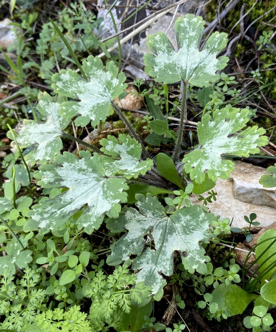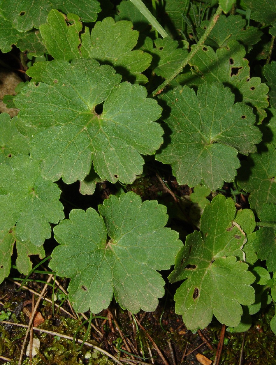 Grundblätter gestielt, Blattspreite nierenförmig, 6 - 14 cm lang, 4 - 9 cm breit, (3-)5- lappig, am behaart, Abschnitte mit +/- abgerundeten Zähnen, Blattstiele langhaarig