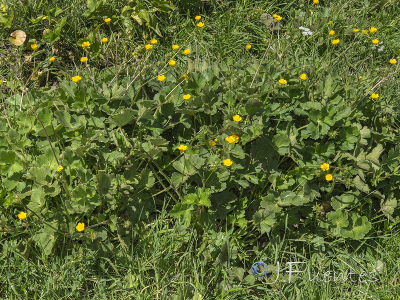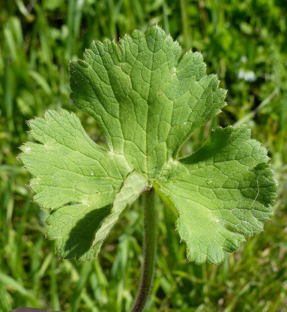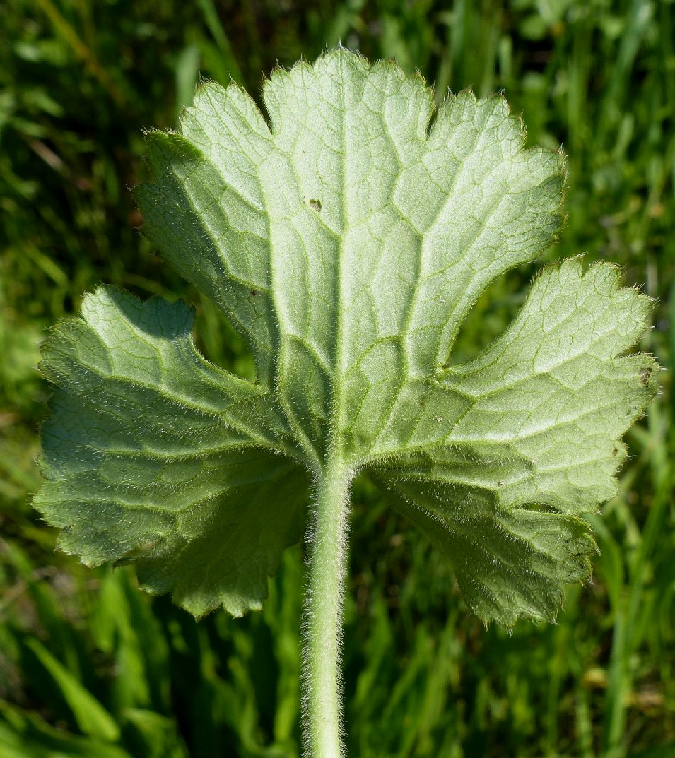 Blattspreite der Grundblätter +/- 5- eckig, 3- lappig, 3 - 10 cm lang, 4 - 13 cm breit, Abschnitte eirundlich, am Grund keilig, meist nicht bis zum Grund getrennt, vorne gezähnt