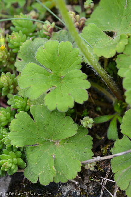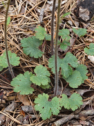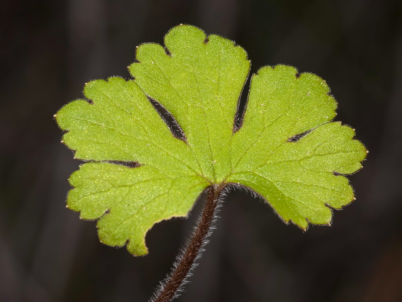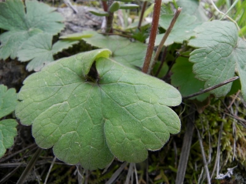 Grundblätter lang gestielt, dicht mit weißen aufrechten Haaren behaart, Blattspreite rundlich, 20 - 60 mm im Durchmesser, 3 - 5- lappig, Blattlappen ca. zu 2/3 eingeschnitten, stumpf gelappt