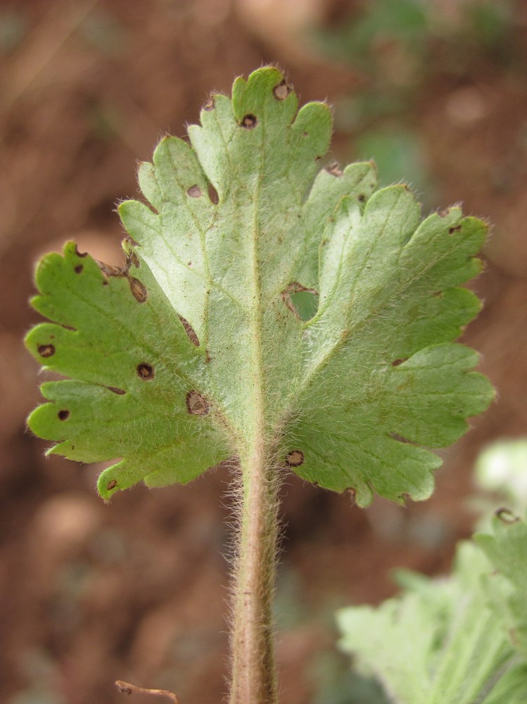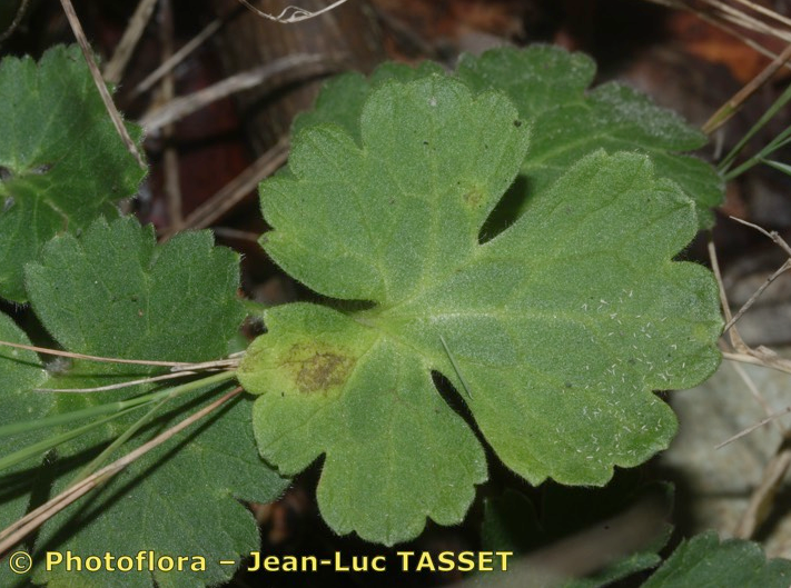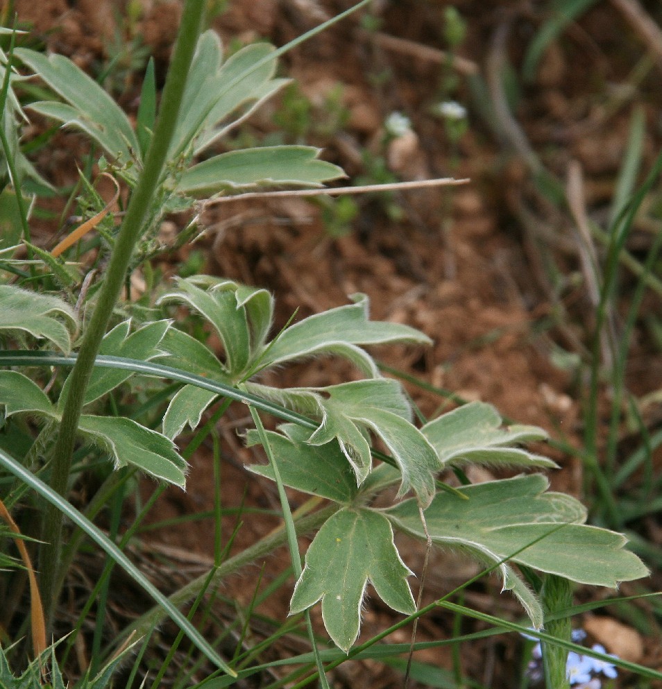 Grundblätter meist länger als breit, 3- lappig, am Grund herzförmig, unterseits und oberseits am Rand +/- seidenhaarig, Blattlappen kurz 3 - 7- lappig, am Grund keilförmig, Mittellappen gestielt oder plötzlich verschmälert