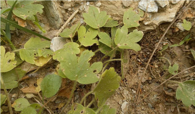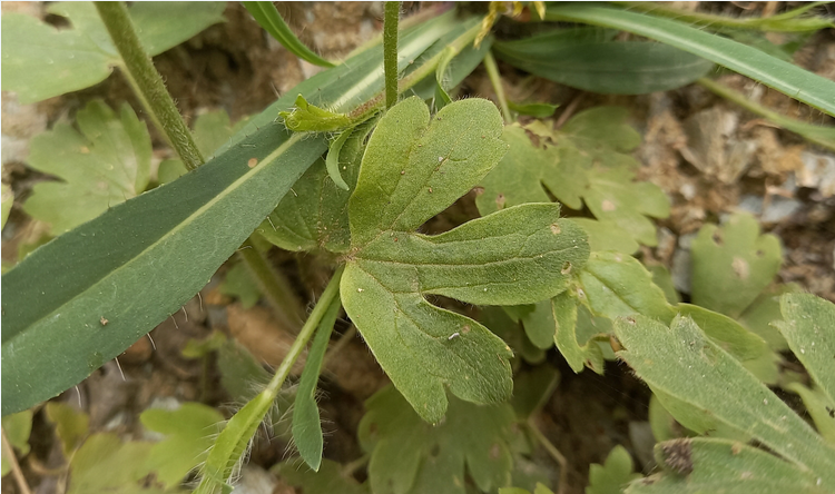 Untere Stängelblätter und Grundblätter dreiteilig, Buchten breit oder V- förmig, Lappen bis zur Hälfte oder bis zum Grund geteilt, am Grund herzförmig, Abschnitte vorne stumpf gelappt