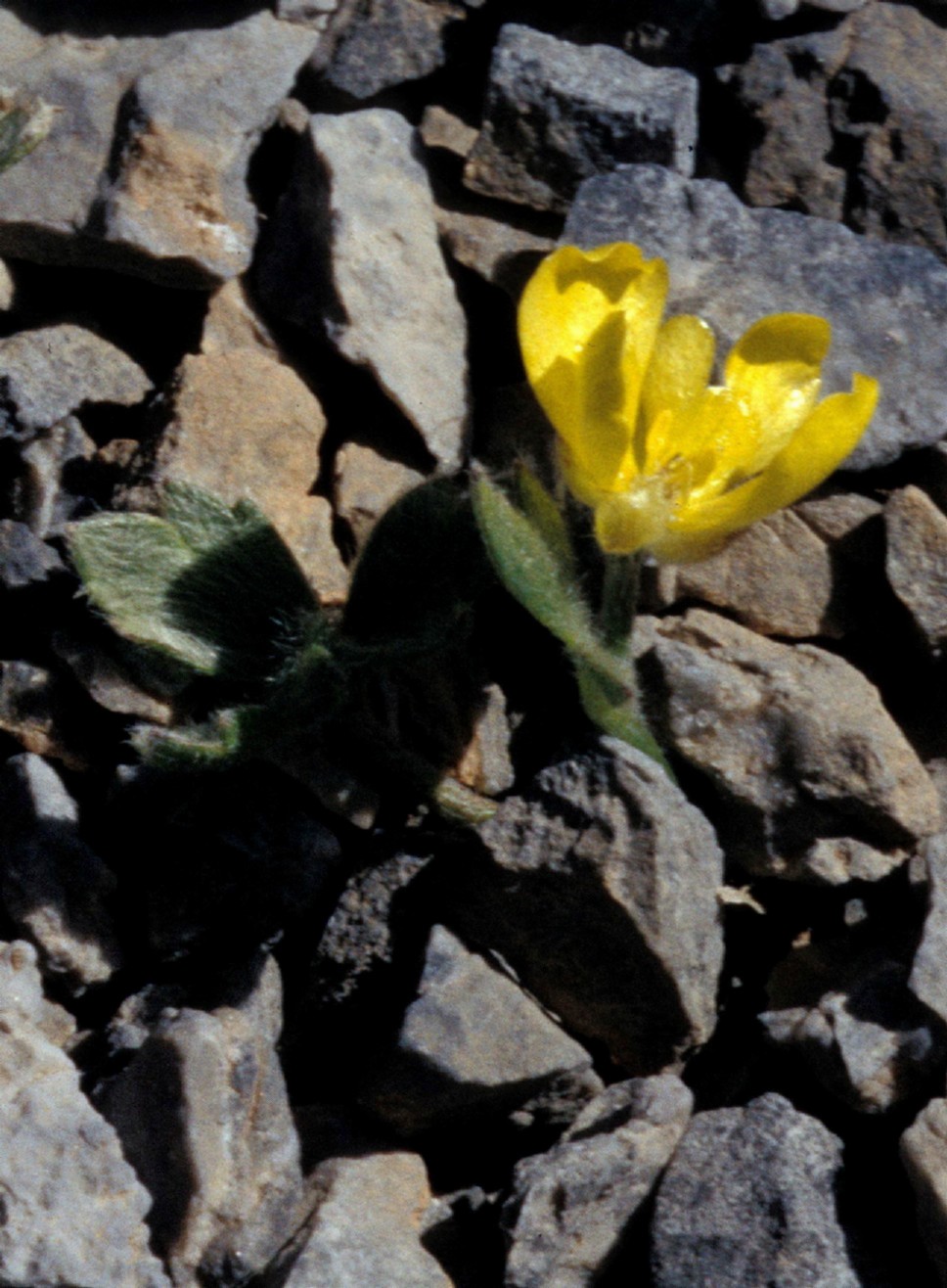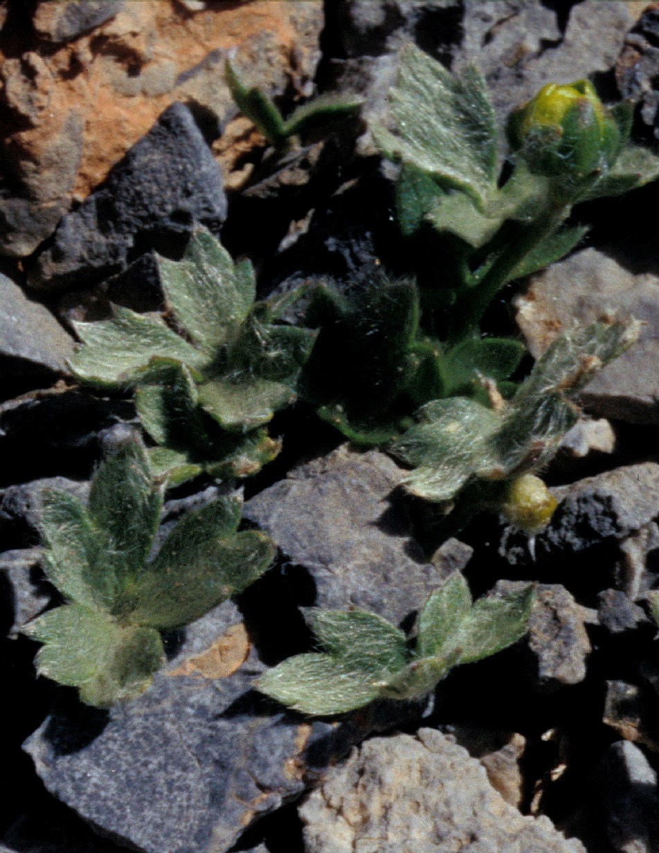 Grundblätter 1 - 6 cm lang gestielt, Blattspreite etwas breiter als klang, 1 - 2,5 cm im Durchmesser, beiderseits seifig langhaarig, 3- lappig, Abschnitte eiförmig, vorne meist dreizähnig
