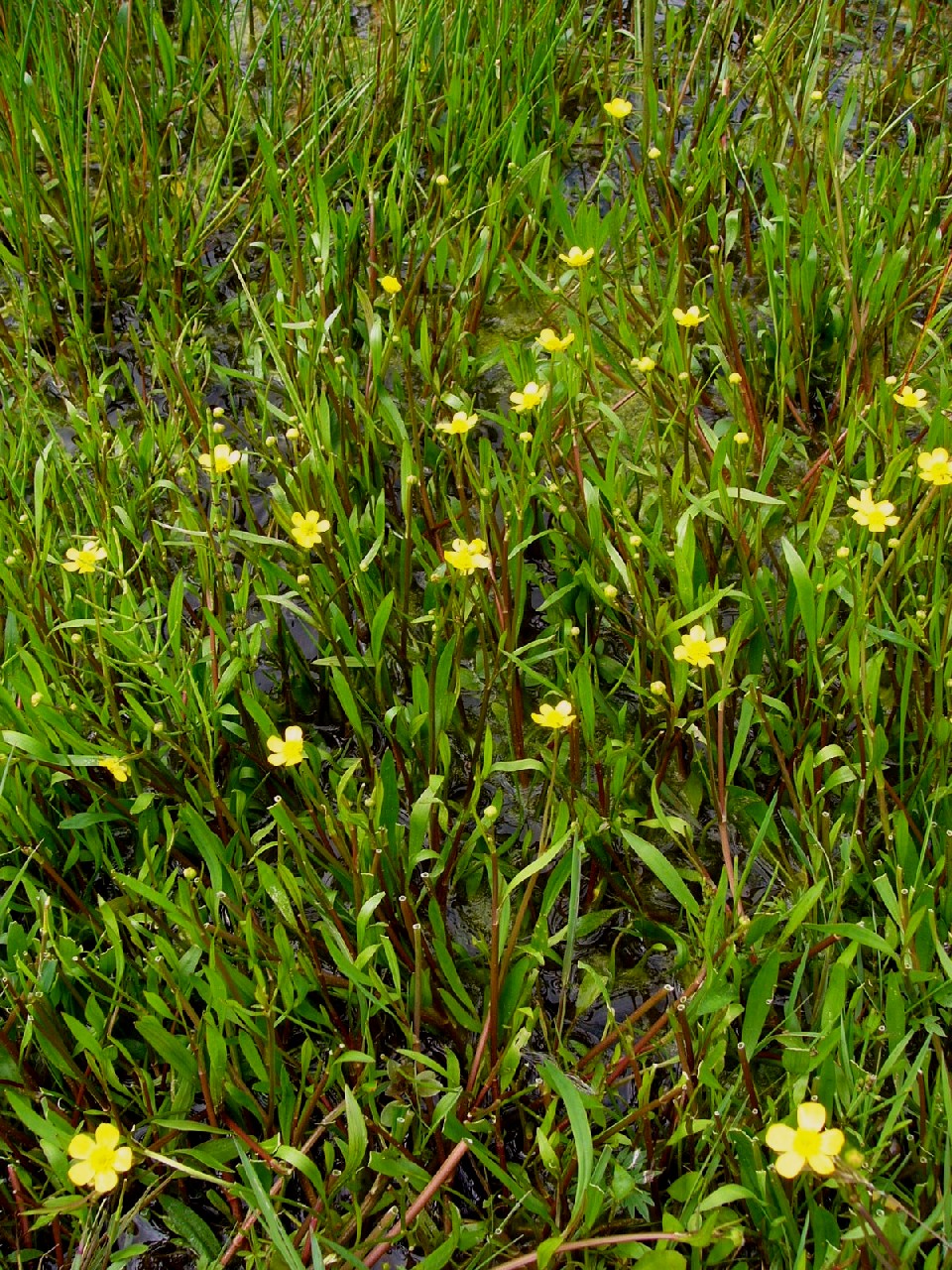 Ranunculus - Pflanzen nasser Standorte, Blüten gelb, meist mit 5 Kronblättern, Blätter ungeteilt, elliptisch oder lanzettlich, Kelchblätter anliegend, alle oder die meisten Blätter stängelständig