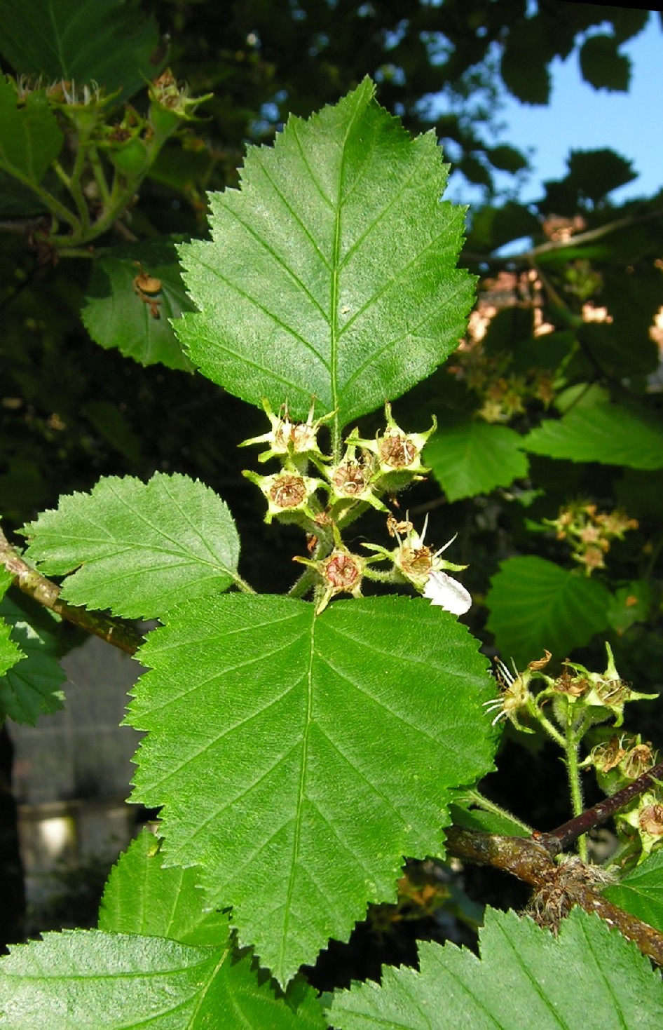 Früchte rot, mit 3 - 4 Steinkernen Blüten mit 3 - 4 Griffeln, Blätter schwach gelappt, scharf gesägt > Blätter schwach gelappt