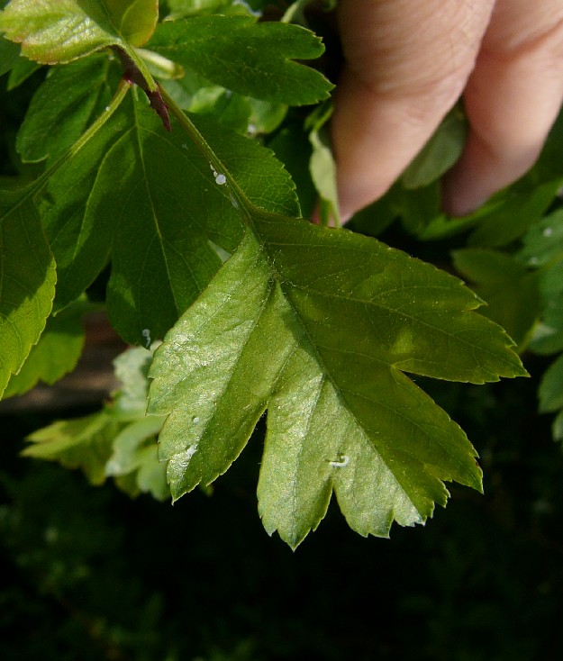 Crataegus- Blätter gelappt, oberseits kahl, Blüten rot
