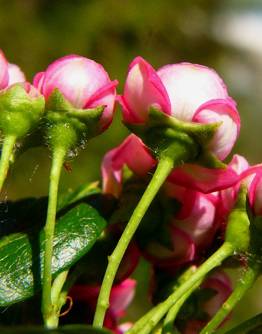 Blüten in Dolden Blüten rot Kelchzähne im unteren Teil verwachsen, behaart Blüten meist gefüllt Blüten meist mit 2 Griffeln, ohne Staubblätter Früchte oft nur spärlich ausgebildet