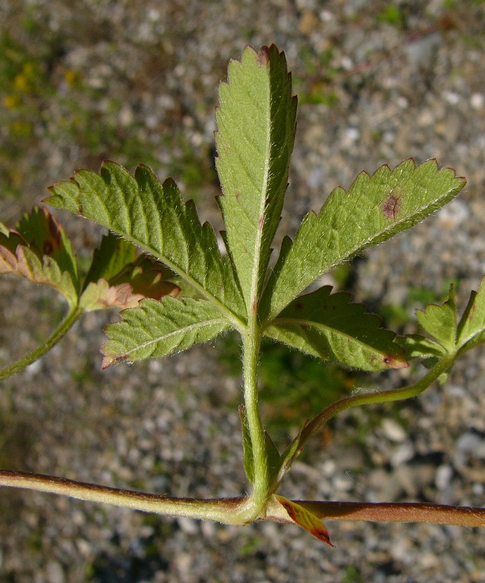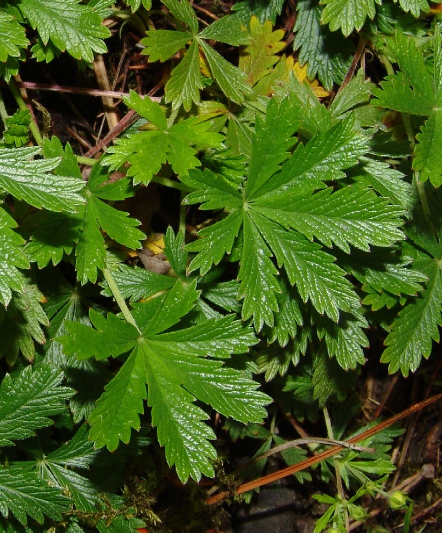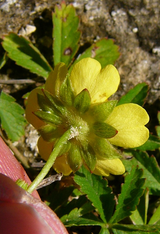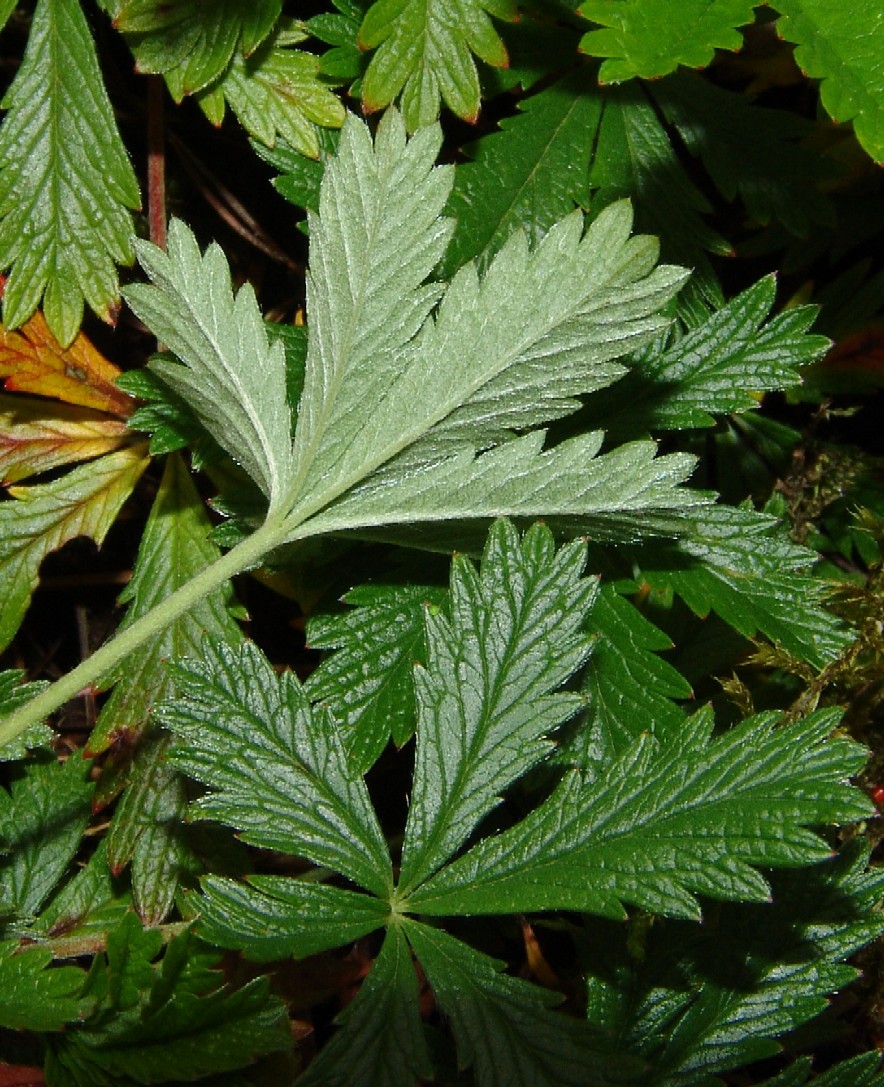 Potentilla - Pflanze 5 - 20 cm hoch, lockerrasig, Blüten gelb, 5 Kronblätter, Früchte nicht erdbeerähnlich, Blätter gefingert, meist 5- zählig, Blattunterseite nicht sternhaarig, Blättchen mit mehr als 5 Zähnen jederseits