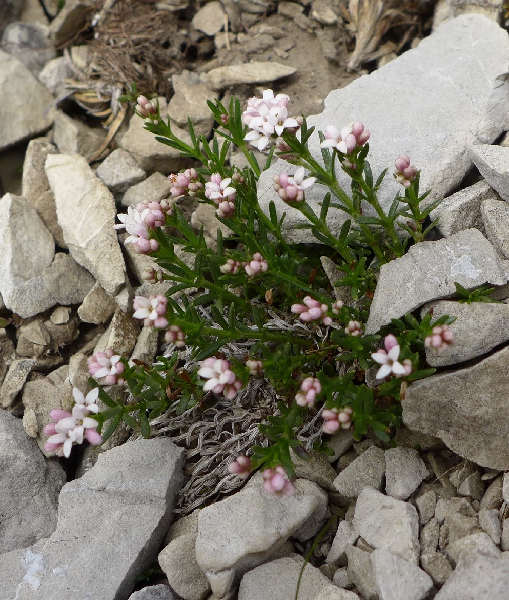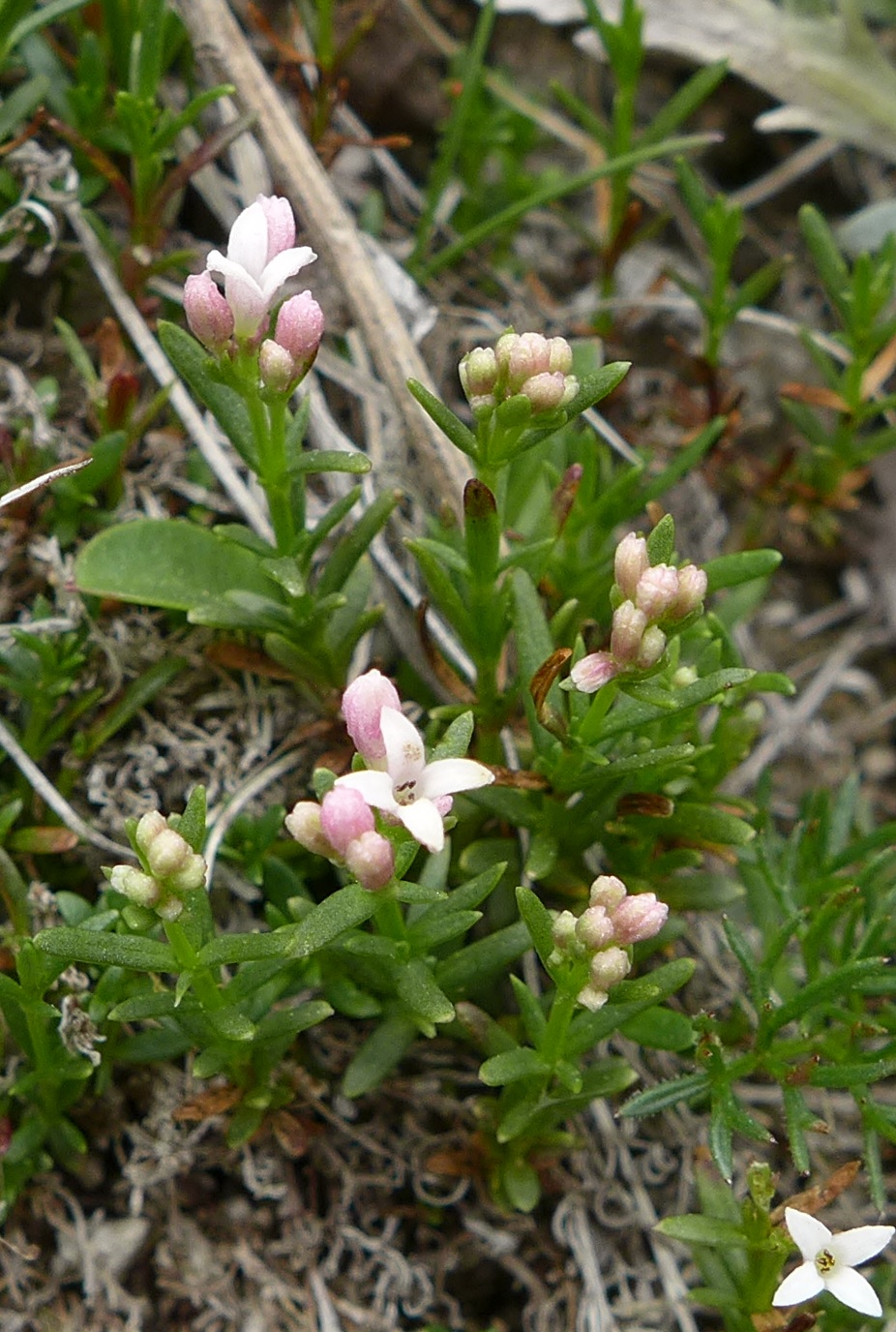 Pflanze 5 - 15 cm groß mittlere und obere Stängelblätter länger als die Internodien Blüten weiß oder rosa, 3 - 4 mm lang, mit 4 Kronzipfeln ohne Granne