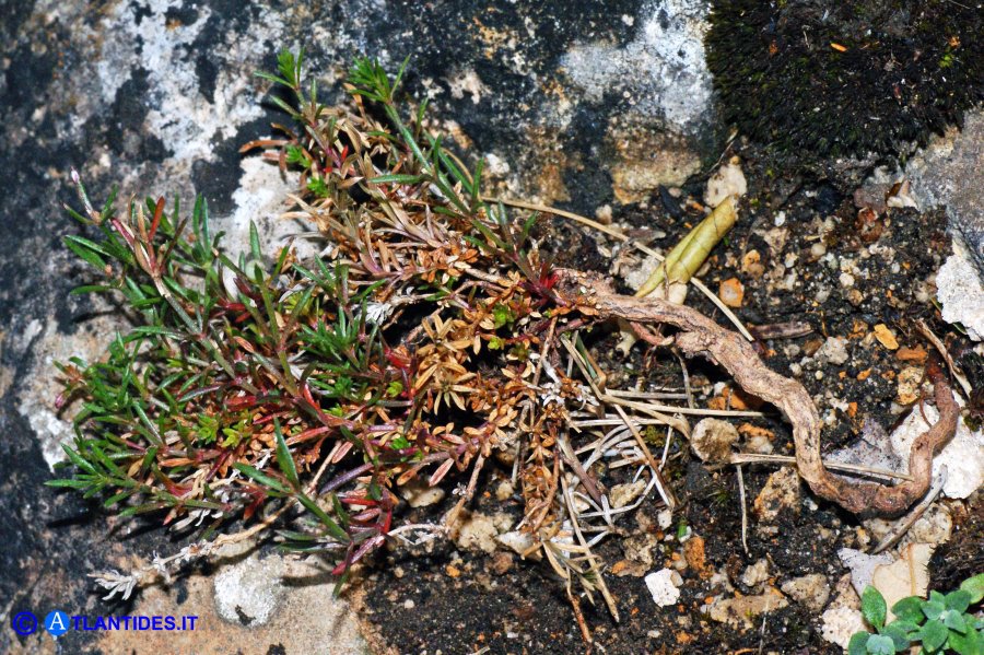 Stängel kahl, mittlere Internodien 1 - 3 mal so lang wie die Blätter, Blätter im oberen Teil gegenständig, lanzettlich, am Grund des Stängels gedrängt, zu 4 im Quirl, eilanzettlich, dick, +/- stumpf, 15 - 30 mm lang, 1,5 - 2 mm breit, am Rand umgerollt