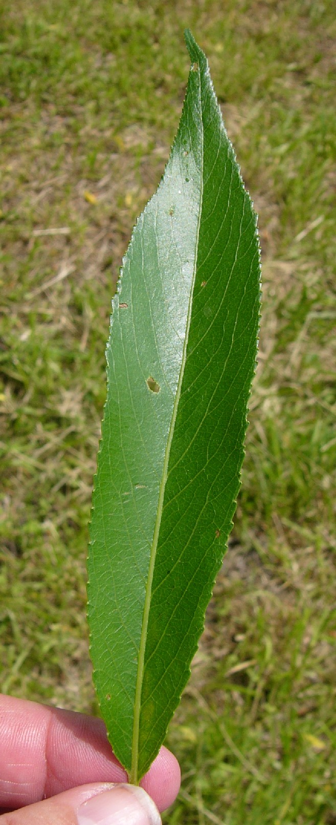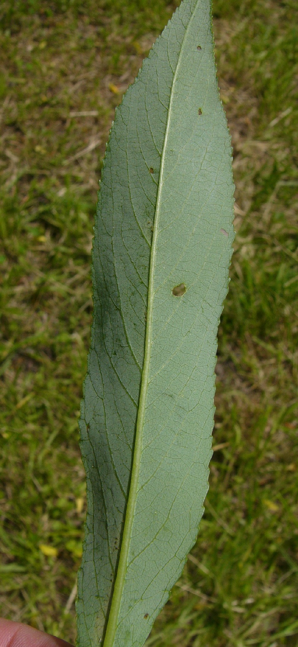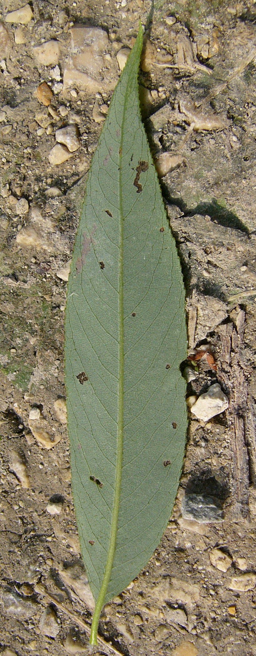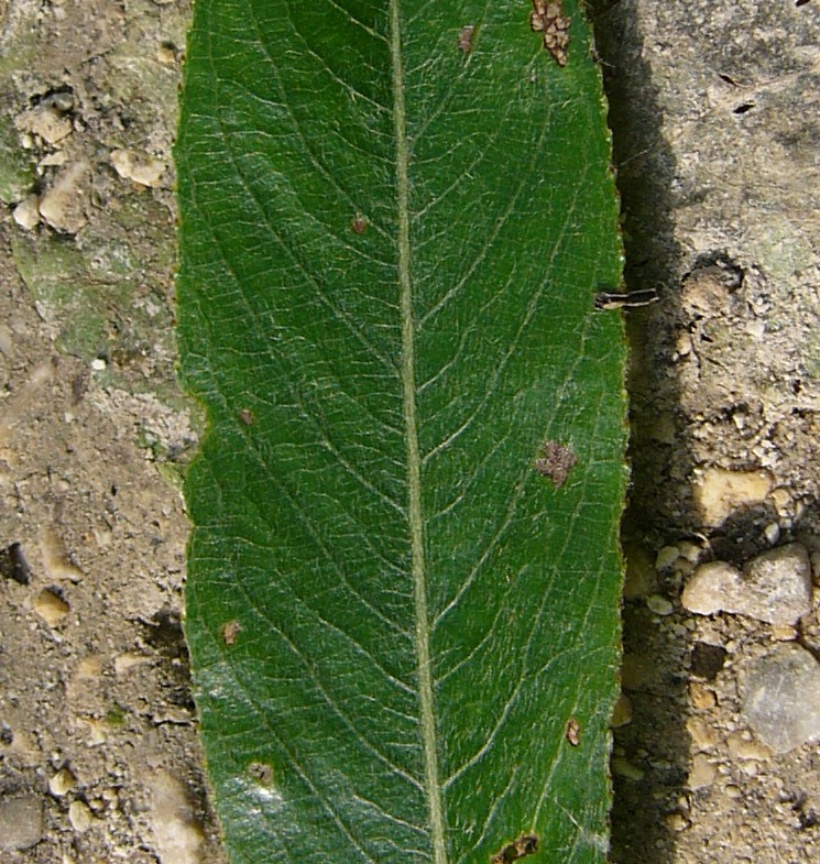 Blätter 8 - 15 cm lang, ca. 2,5 cm breit, größte Breite unterhalb der Mitte, Blattgrund abgerundet oder schief keilförmig, Blätter fein drüsig gesägt (Drüsen auf den Zahnspitzen sitzend),