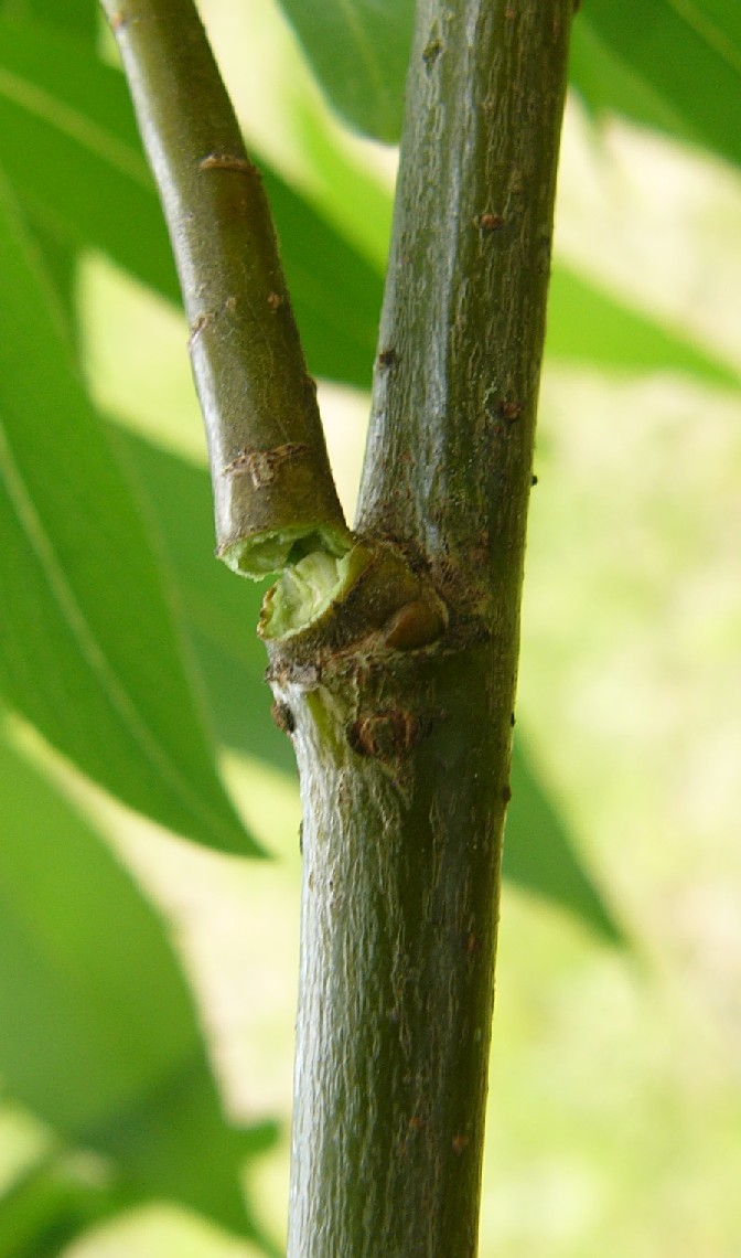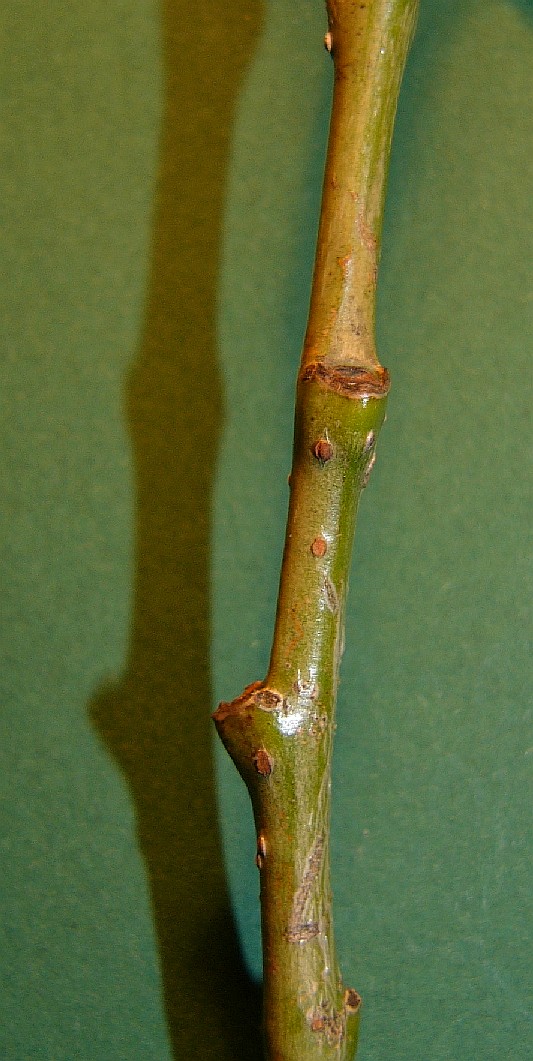 Zweige gelblich bis grau, lackartig glänzend, kahl Rinde innen grün Entrindetes Holz ohne Striemen