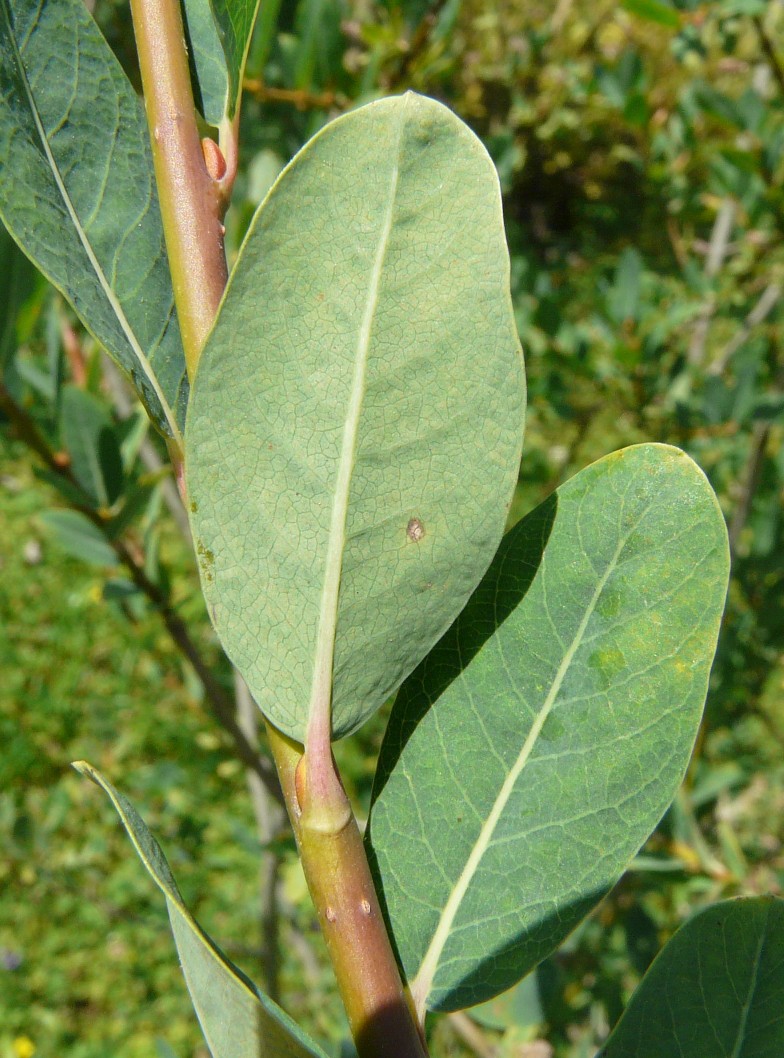 Unterseite kahl, hell blaugrün mit dichtem Wachsüberzug (Blatt ähnlich Vaccinium uliginosum), Nebenblätter fehlend