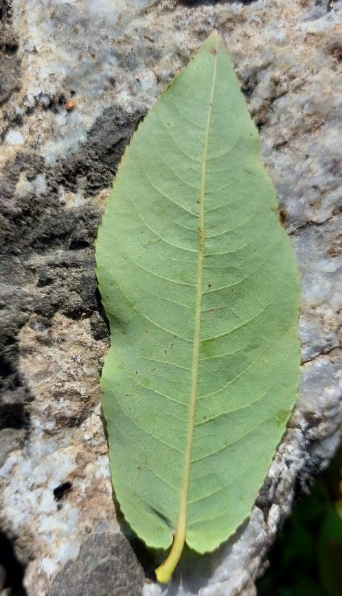 Blätter wechselständig, kahl, eiförmig, in oder unterhalb der Mitte am breitesten, gesägt,