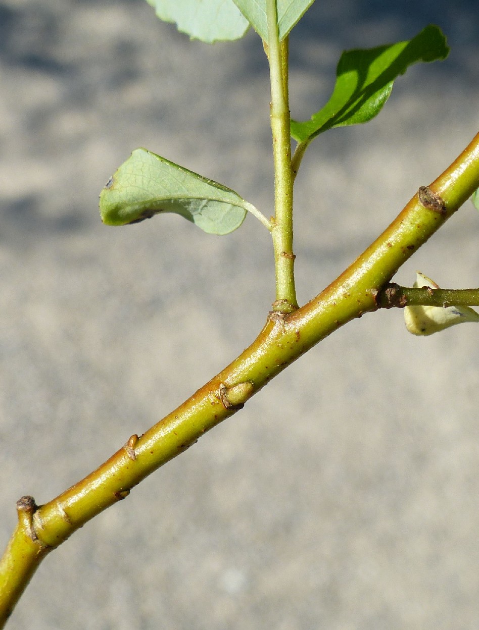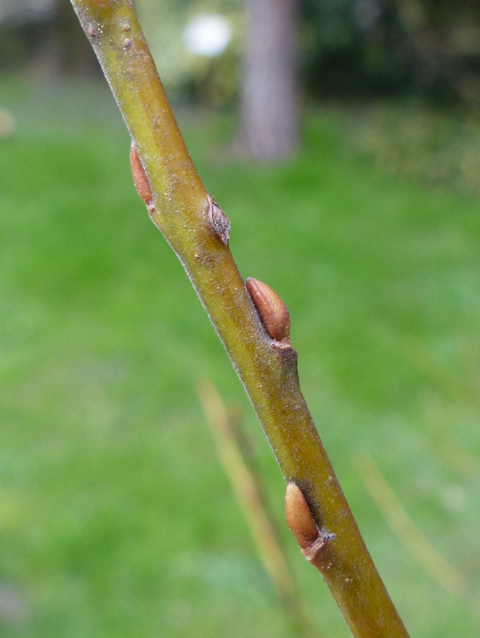 Junge Zweige gelblich bis grünlich, anfangs flaumig, Knospen 2 - 3,5 mm lang
