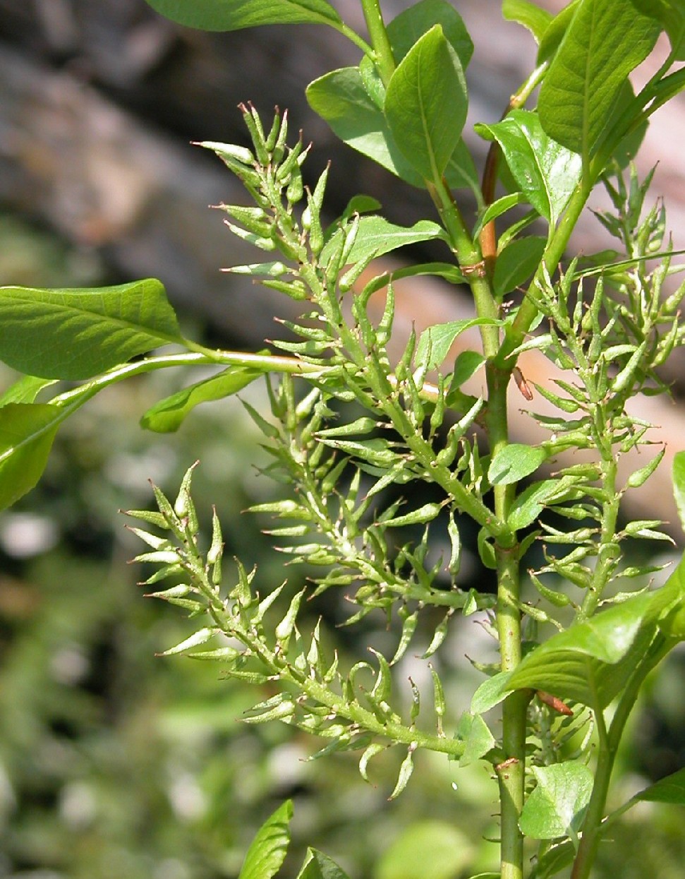 Ältere Zweige graubraun, kahl, an der Basis nicht brüchig Kätzchen seitlich, gestielt, am Grund beblättert Weibliche Kätzchen 20 - 30 mm lang, männliche