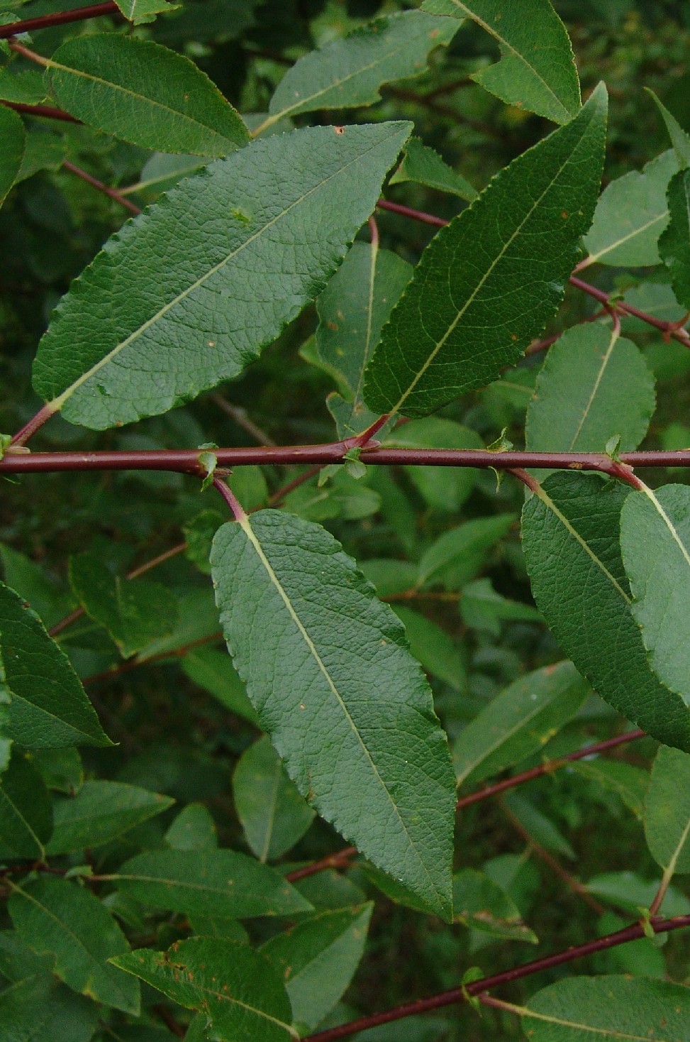 Blätter eilanzettlich, 3-8 cm lang, 1,5-2,5 mal so lang wie breit, kahl, fein gesägt, etwas runzlig, oberseits grün und mässig glänzend, Blattstiel 6-15 mm lang, Nebenblätter an Kurz- und Langtrieben meist deutlich ausgeprägt