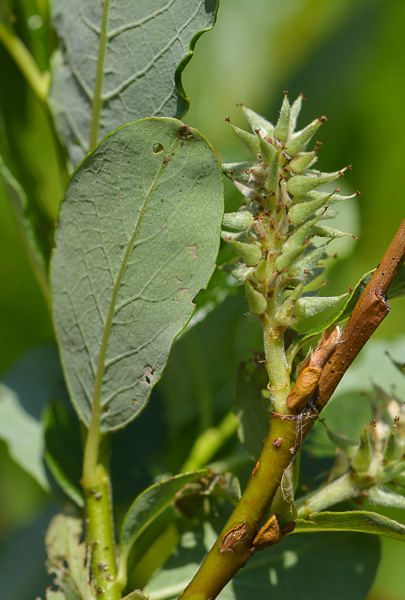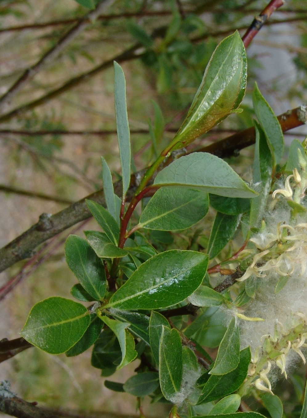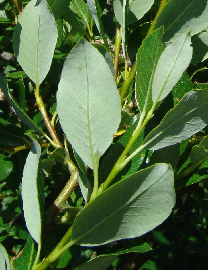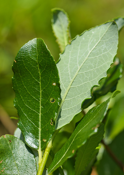Blattunterseite vollständig durch Wachsschicht meergrün, Blattnerven vorspringend, Nebenblätter nur an Langtrieben, maximal 1,5 mm lang, Blattspitze meist gekrümmt