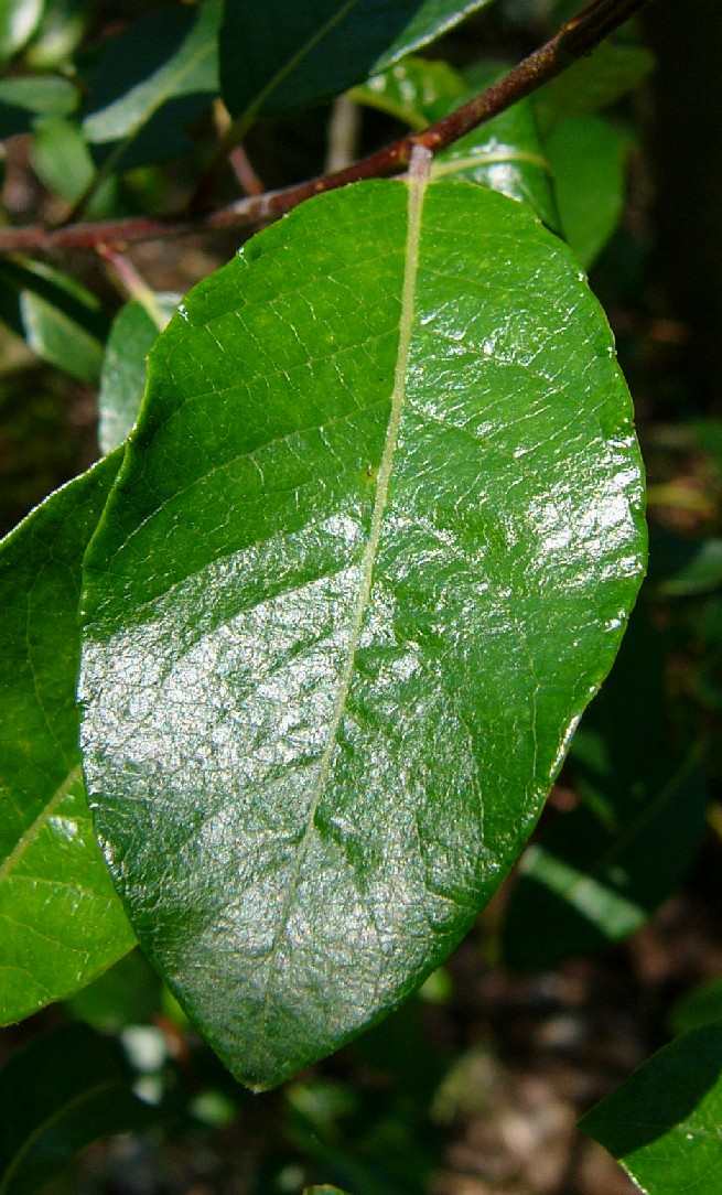 Blätter 4 - 6 cm lang, ca. 2 cm breit, lanzettlich bis verkehrt eiförmig, stumpf oder spitz, Rand gesägt mit Drüsen auf den Zahnspitzen, Oberseite sattgrün, stark lackartig glänzend, kahl Unterseite weißlich matt, mit dichtem Wachsbelag, kahl, Nervatur stark hervortretend, beim Trocknen schwarz-