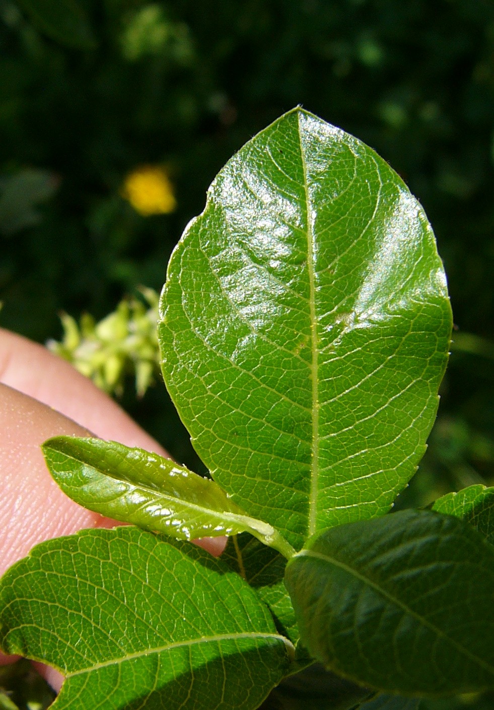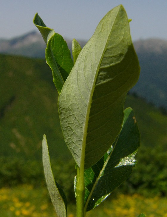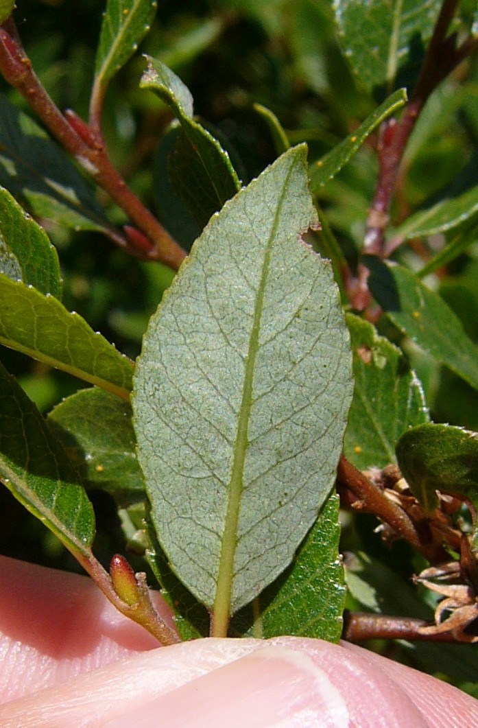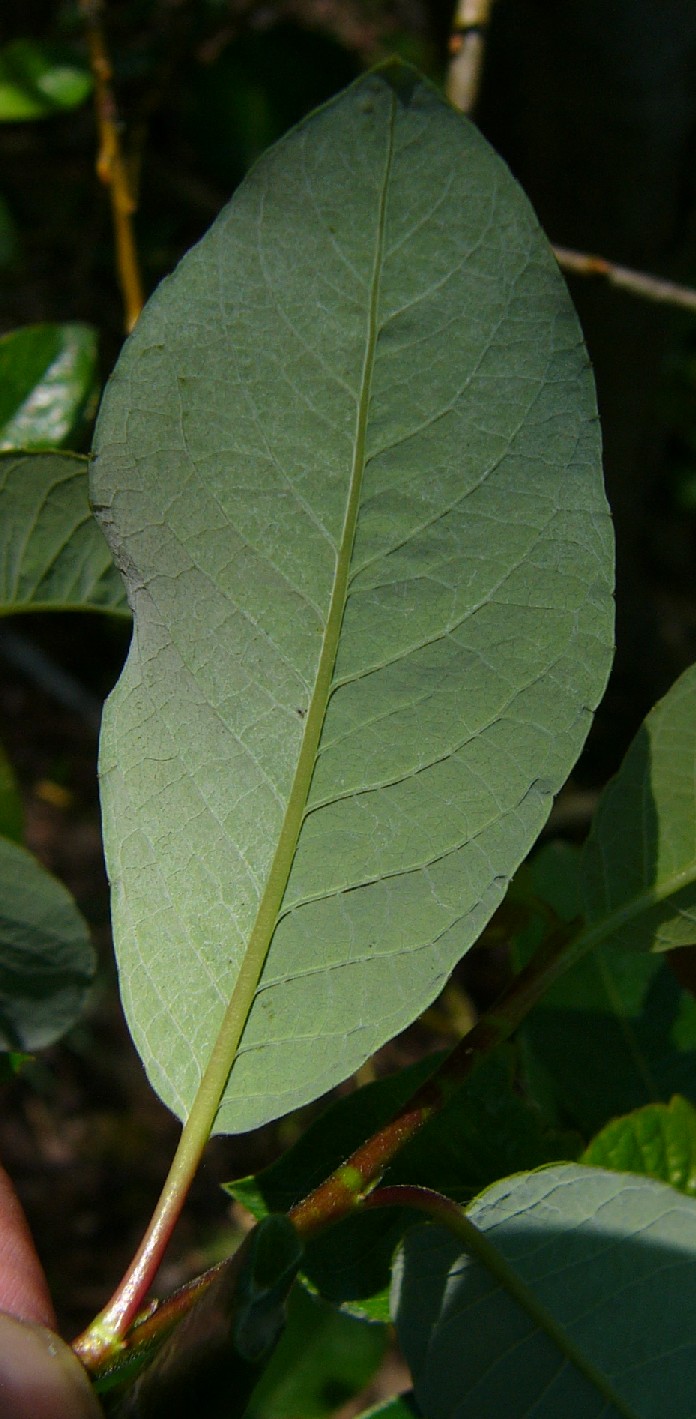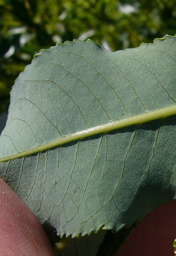 Sommerblätter bis 0,5 - 4 cm lang, eiförmig, größte Breite oberhalb der Mitte, manchmal schief zugespitzt, Rand meist drüsig gesägt, Oberseite grün, stark glänzend Unterseite blaugrün, mit Wachsüberzug bis zur