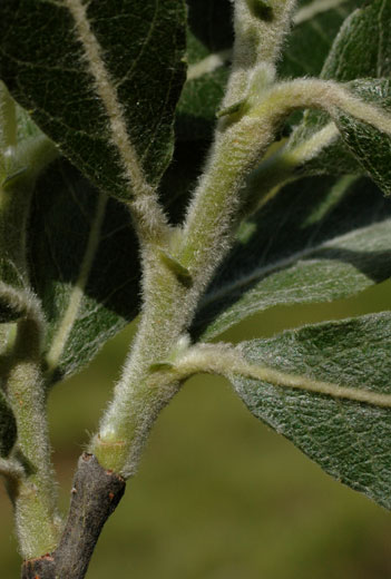 Blätter im Austrieb dicht flaumig, später oberseits verkahlend, dunkelgrün