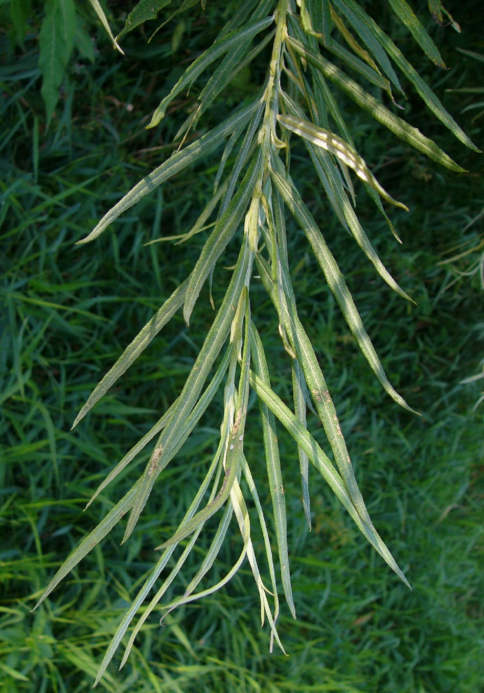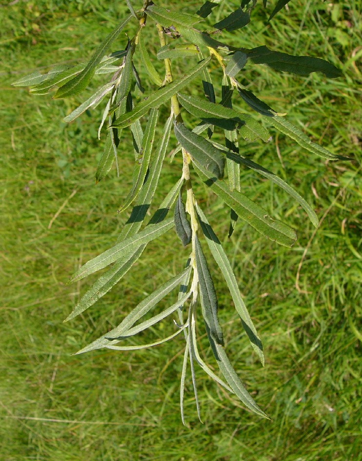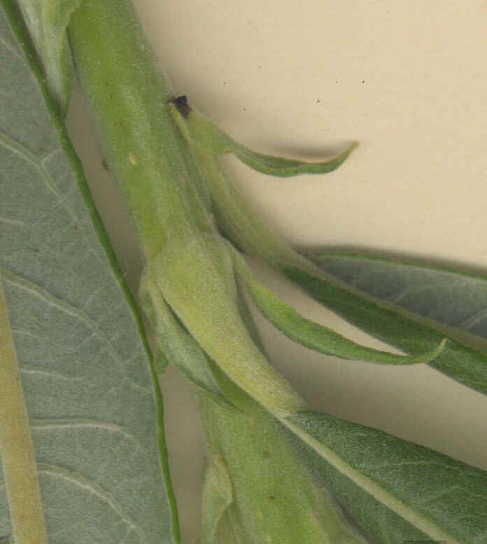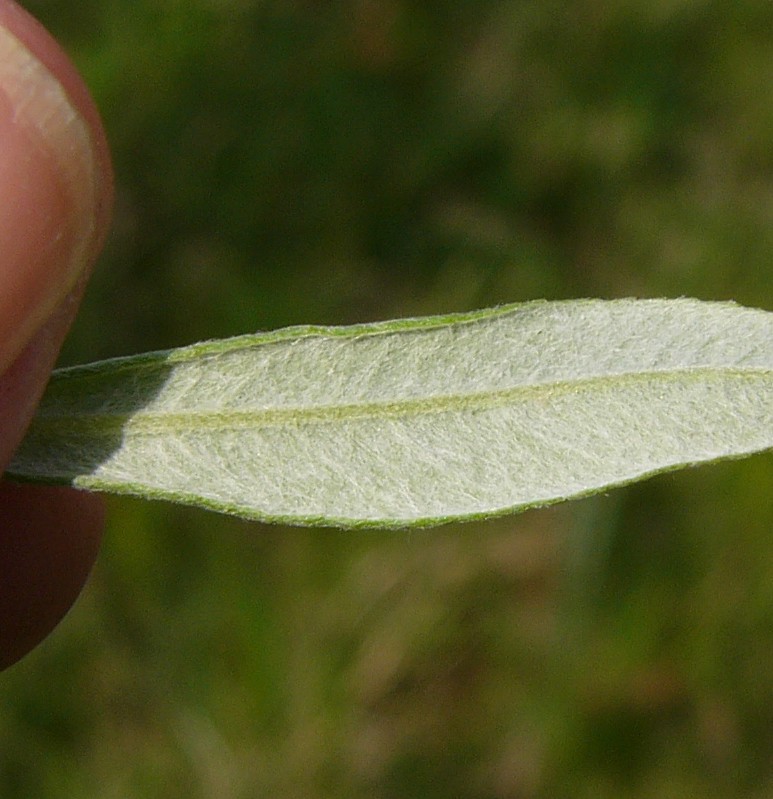 Blattunterseite unterseits matt weißfilzig (im Gegensatz zu Salix alba und Salix viminalis, welche unterseits seidig schimmernd behaart sind) im Austrieb nach unten umgerollt