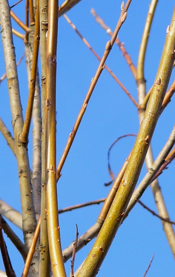 Zweige im Austrieb grün, später olivgrün bis braun