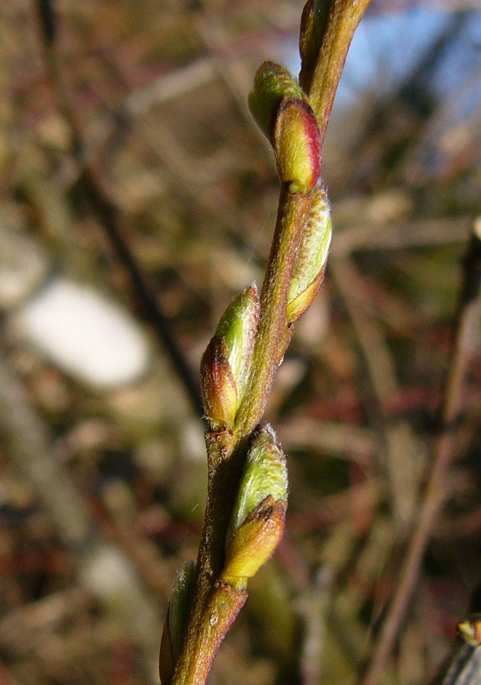 2 - 10 m hoher Strauch, seltener Baum Kätzchen vor dem Laubaustrieb erscheinend Blütenknospen nicht flaumhaarig (keine "Palmkätzchen) Junge männliche Kätzchen länglich, Frucht birnenförmig, mit langem Hals, kahl, gestielt, Zweige zerstreut flaumig, später gelblich bis rötlich braun, glänzend, kahl, an der Basis brüchig Blätter im Austrieb oberseits dicht behaart, am Rand fein gezähnelt