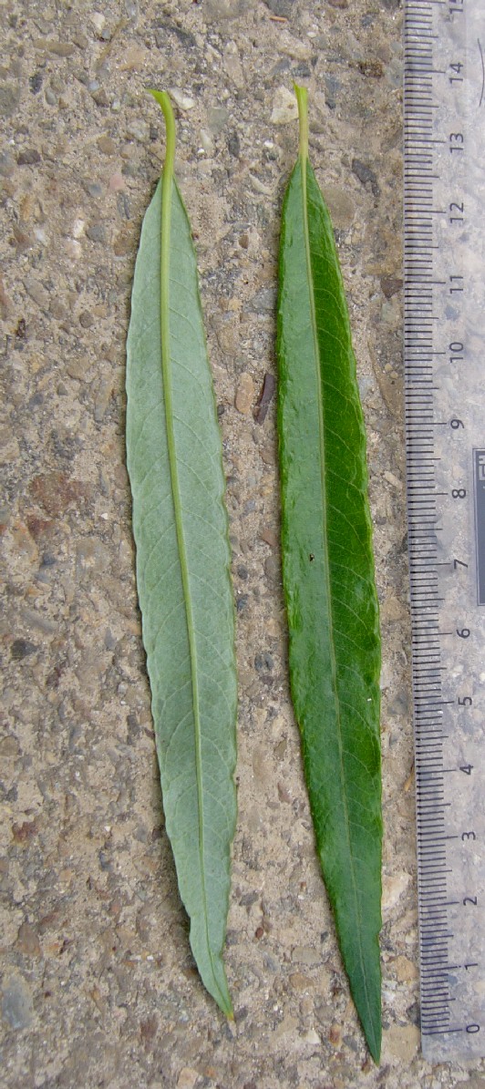 Blätter 10 - 25 cm lang, 10 - 20 mal so lang wie breit glänzend, unterseits mit Seidenhaaren > 1