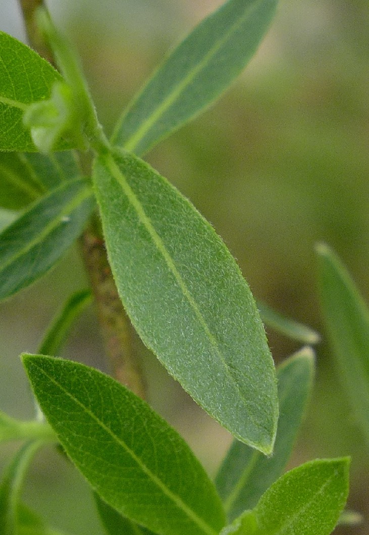 Untere Blätter gegenständig, Blattunterseite junger Blätter seidenhaarig, Haare kurz, parallel zu den Seitennerven