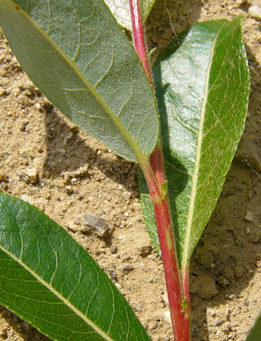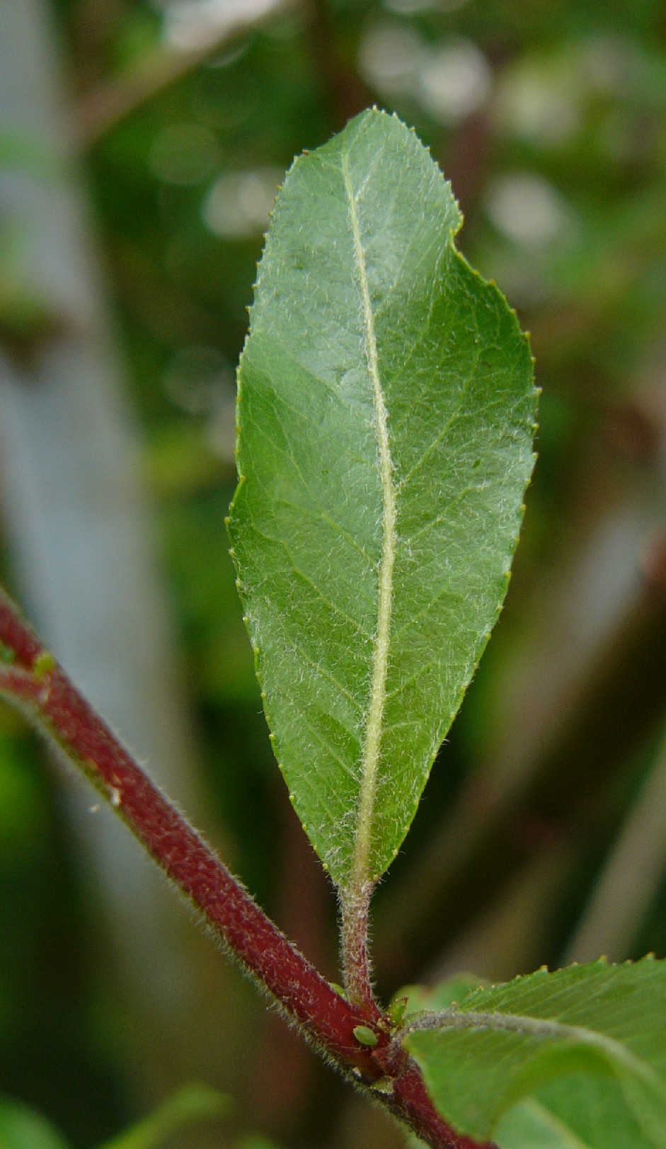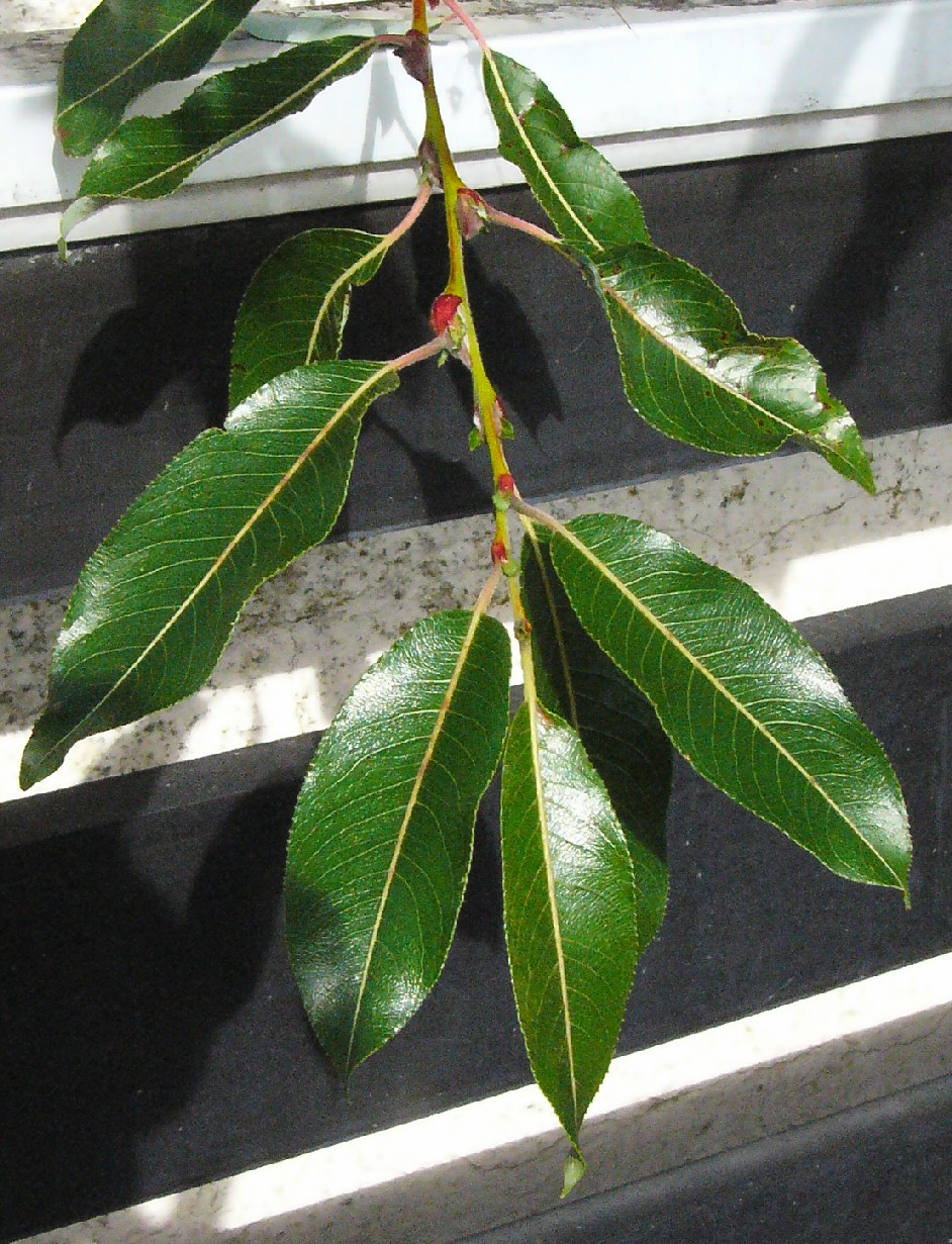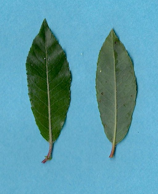 Fruchtknoten seitlich stark zusammengedrückt, kurz gestielt, kahl Blätter 6 - 12 cm lang, schmal lanzettlich, 5 - 7 mal so lang wie breit, lang zugespitzt, regelmäßig drüsig gesägt, beiderseits mit mehr als 15 Seitennerven, Rand flach, Oberseite grün, stark glänzend, anfangs behaart, später verkahlend