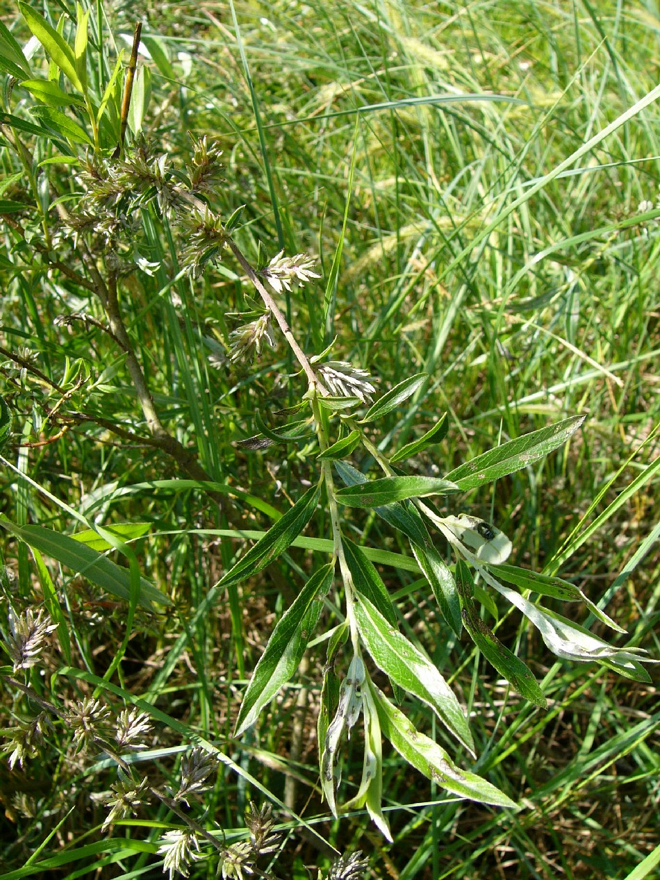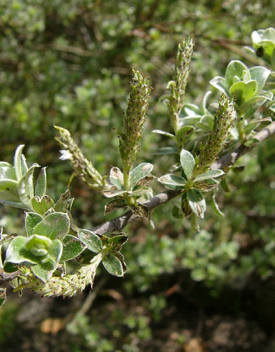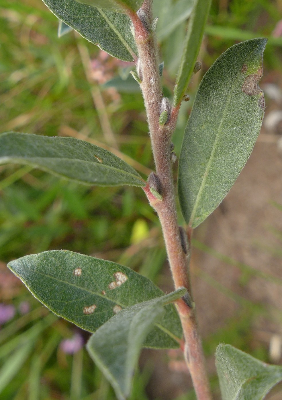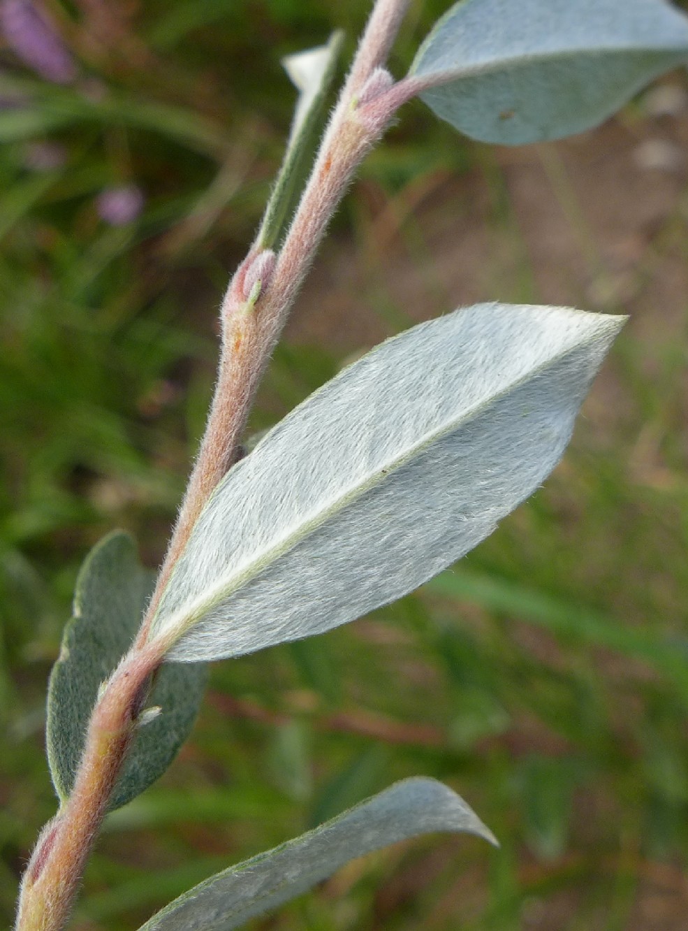 20 - 100 cm großer Strauch Kätzchen mit den Blättern erscheinend, oval Blätter 3 - 5 mal so lang wie breit, mit 4 - 8 NervenpaarenB oberseits verkahlend, grün, Blätter unterseits blaugrün mit schütterer seidiger Behaarung