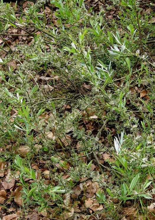 20 - 100 cm großer Strauch Blätter 5 - 10 mal so lang wie breit, 2 - 5 cm lang, an beiden Enden verjüngt, oberseits zuletzt kahl und dunkelgrün, unterseits silbriggrau, mit 8 - 12 Nervenpaaren